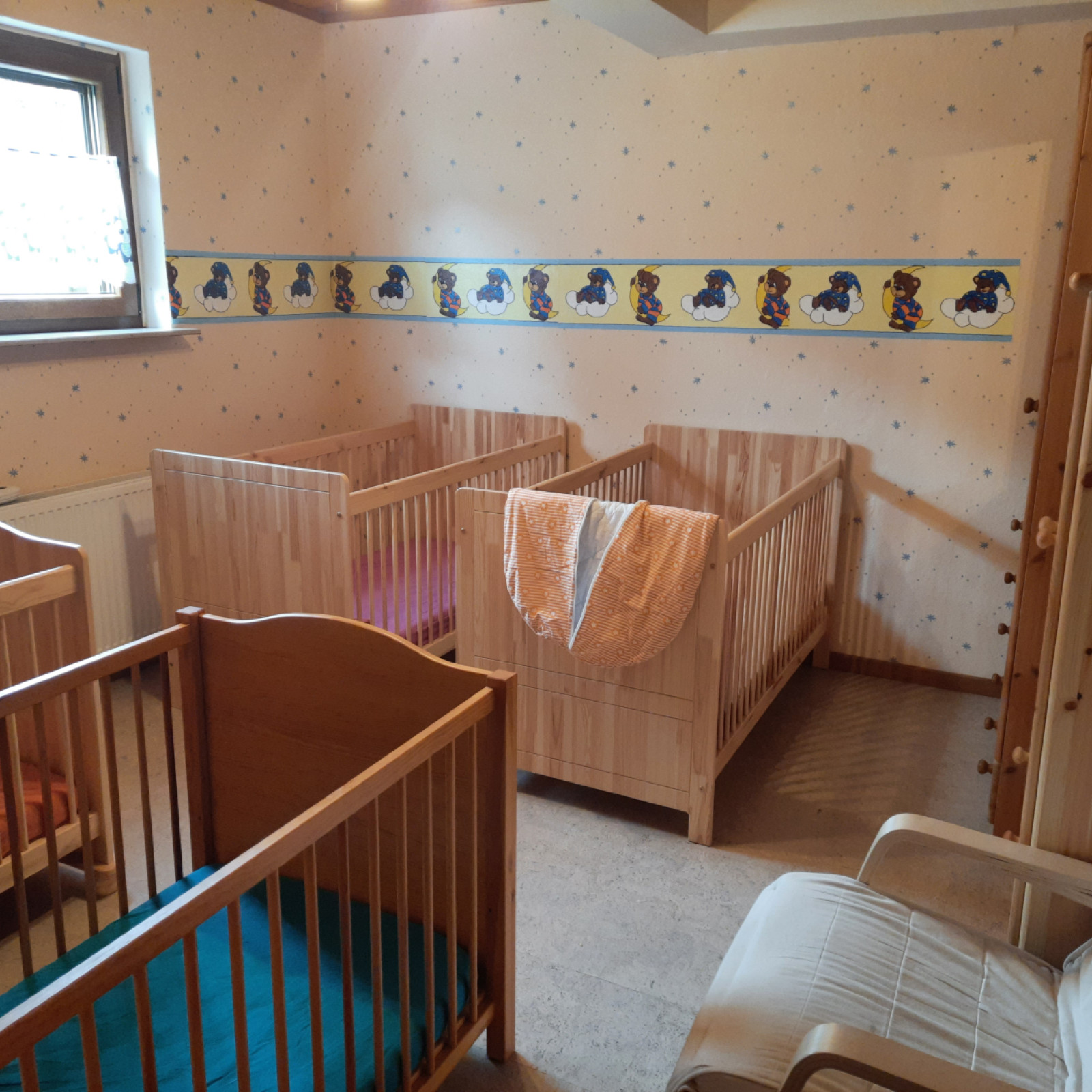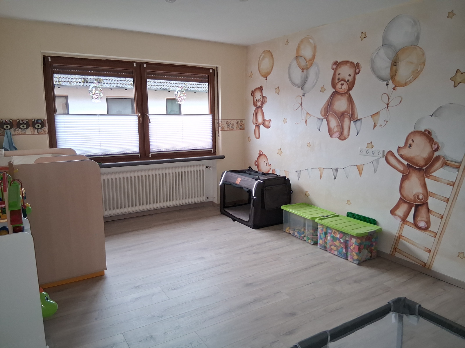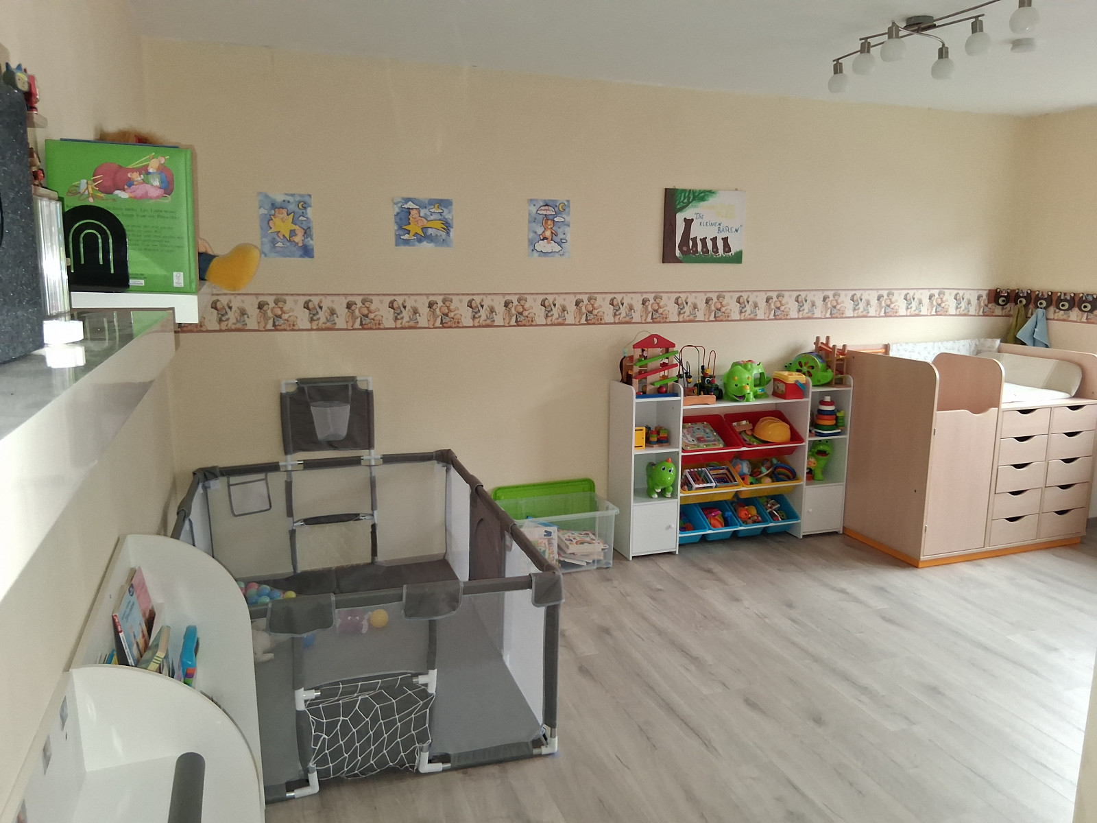 Hinter dem Haus befindet sich ein großer Garten, der zum Spielen und Toben einlädt und wo wir auch die Möglichkeit haben, Obst und Gemüse anzubauen. Im Garten befinden sich außerdem noch eine Schaukel, zwei Rutschen und eine große Sandkiste.