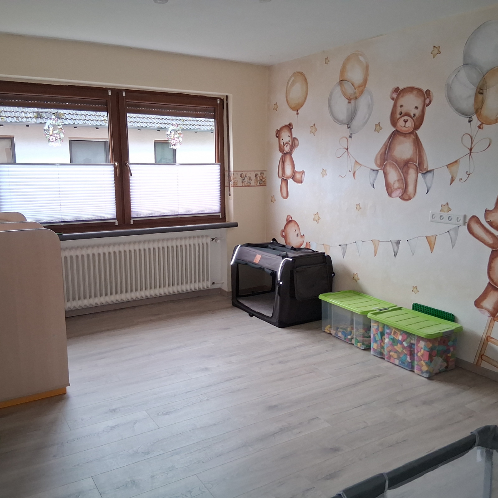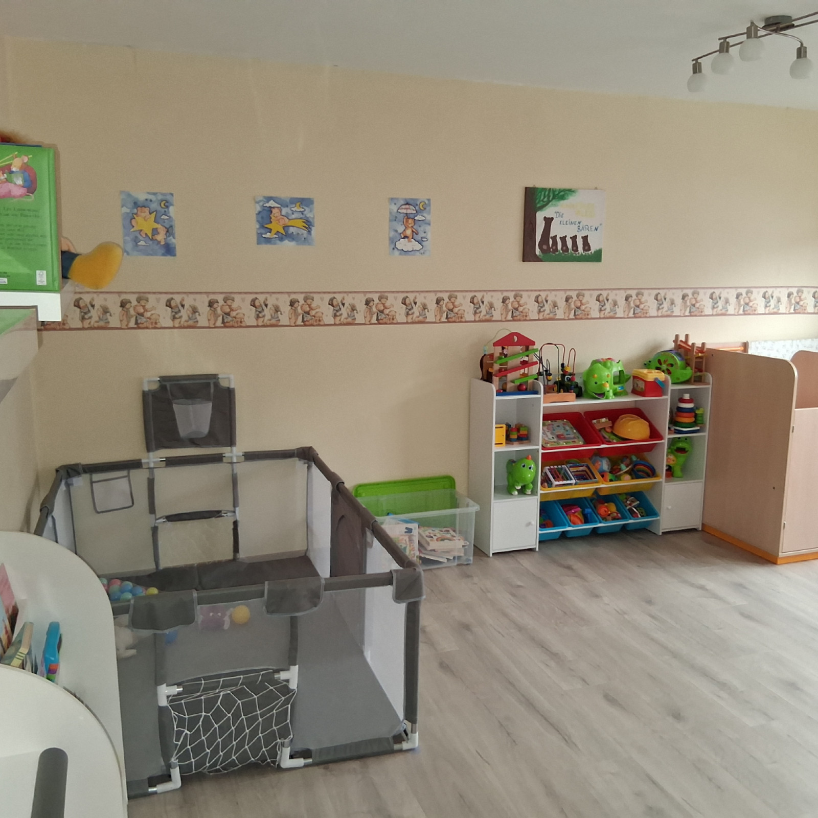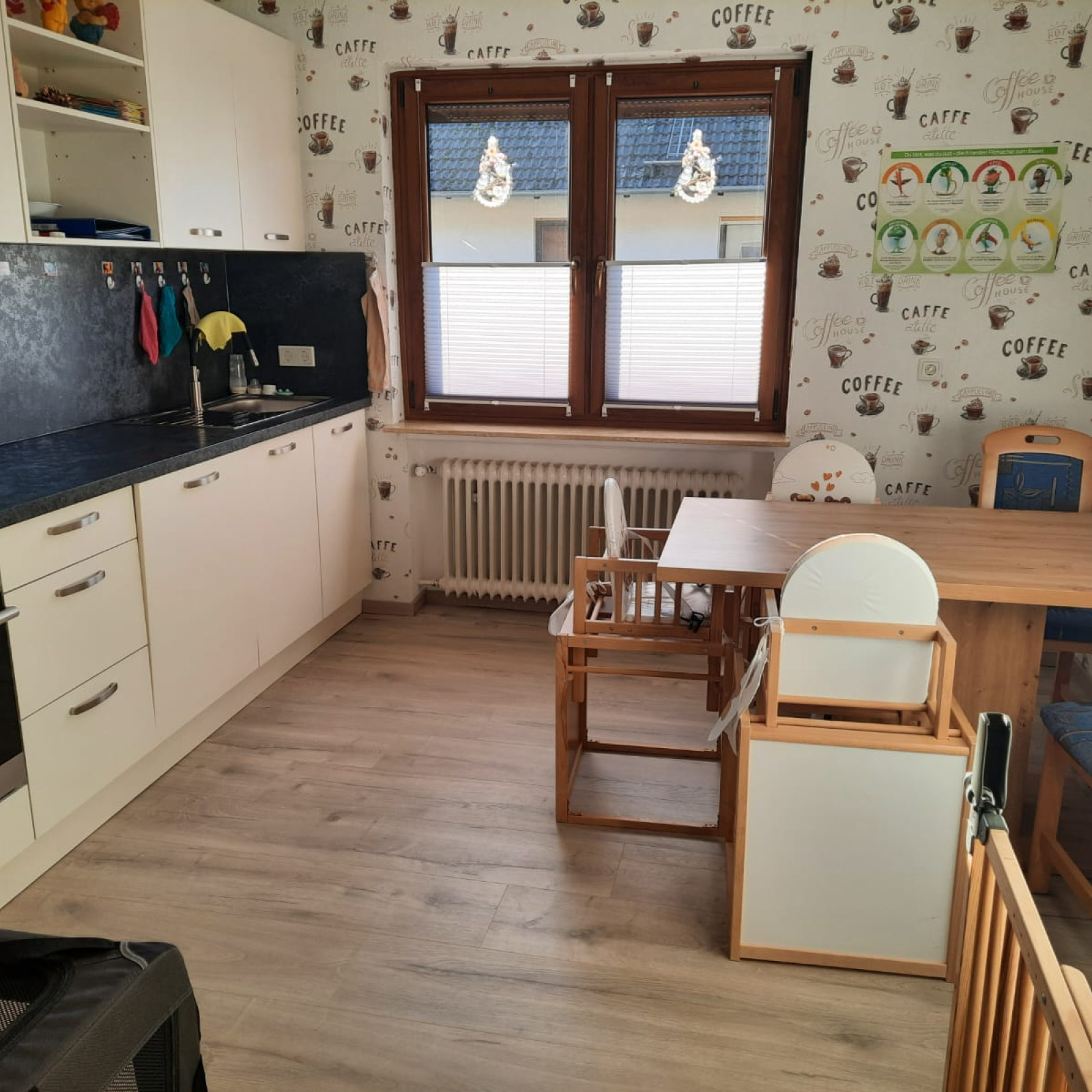 Hinter dem Haus befindet sich ein großer Garten, der zum Spielen und Toben einlädt und wo wir auch die Möglichkeit haben, Obst und Gemüse anzubauen. Im Garten befinden sich außerdem noch eine Schaukel, zwei Rutschen und eine große Sandkiste.